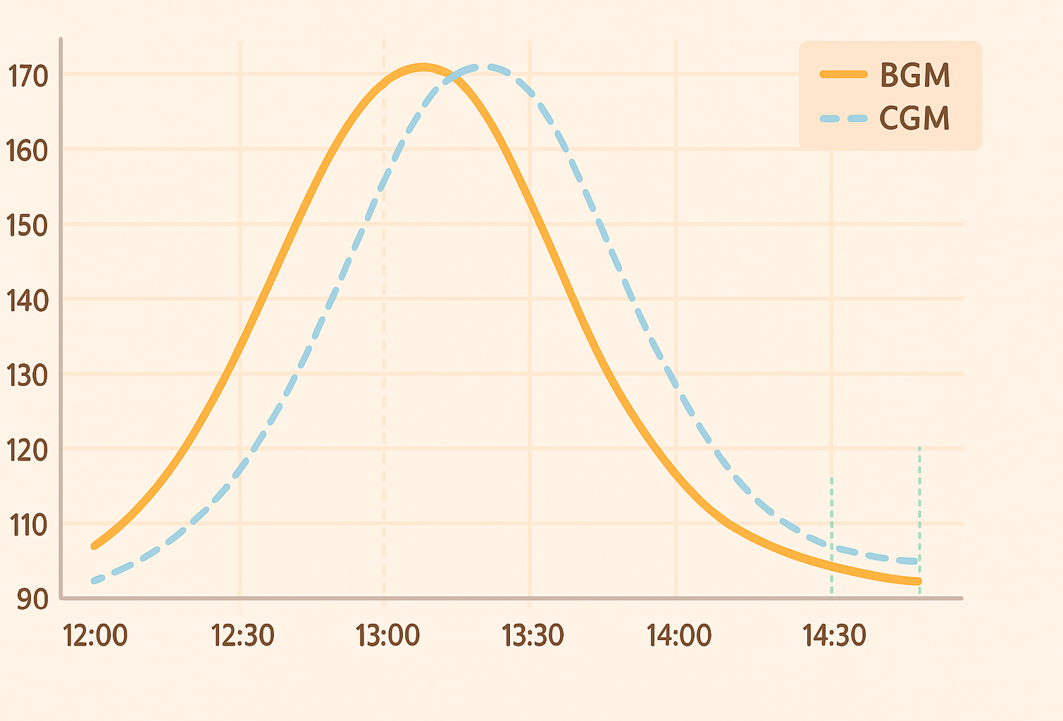 One thing to keep in mind: glucose in the fluid under your skin usually lags behind fingerstick readings by about 5–15 minutes. That’s why you may notice a difference between BGM and APP, and this difference is particularly pronounced when blood glucose rises or falls rapidly.