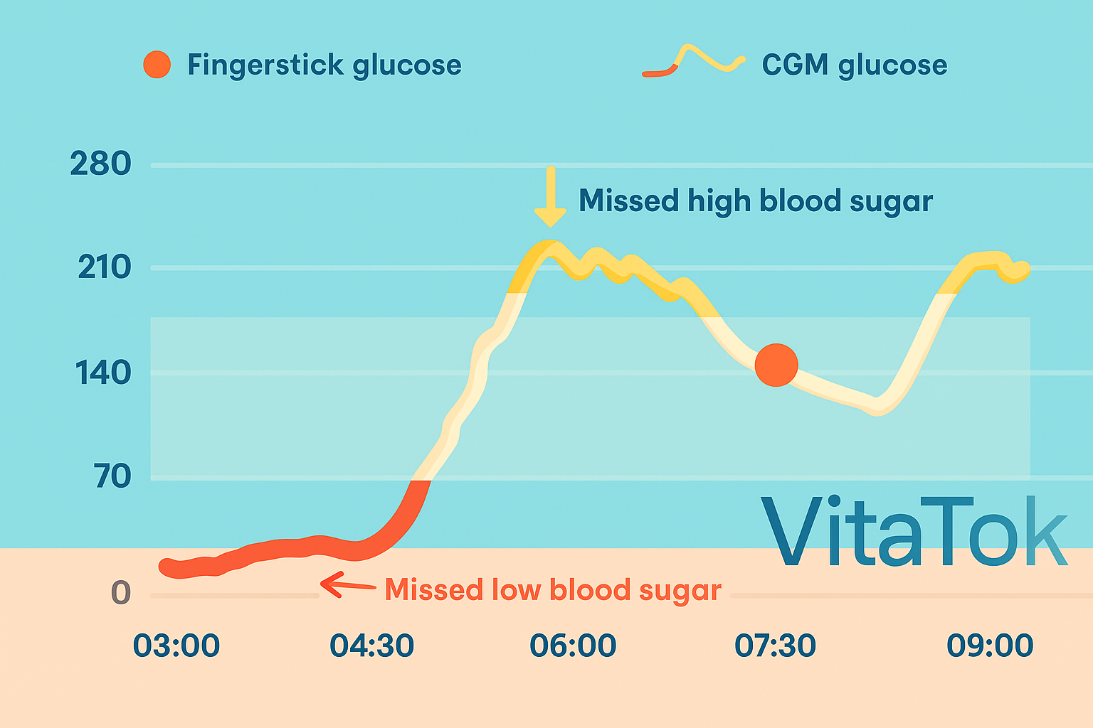 CGM can catch things fingersticks often miss, like post-meal spikes or silent overnight lows. It can even help reveal patterns such as the dawn phenomenon or the Somogyi effect.