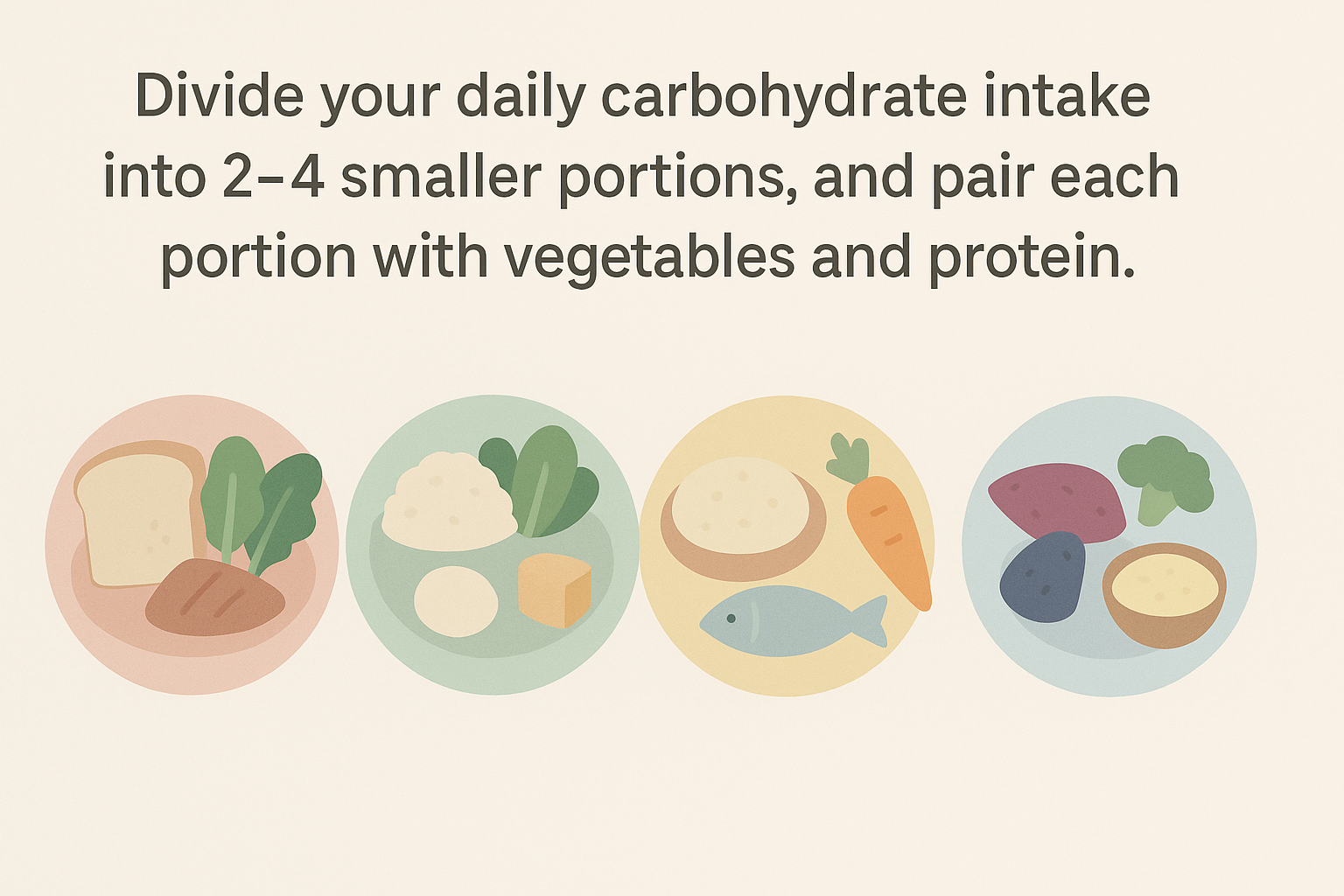 - Divide your daily carbohydrate intake into 2–4 smaller portions, and pair each portion with vegetables and protein.