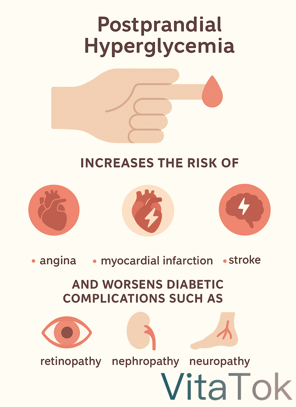 - Independent risk factor: Postprandial hyperglycemia significantly increases the risk of cardiovascular and cerebrovascular events, even when fasting glucose and HbA1c are within the normal range (DECODE Study Group, Diabetologia, 1999).