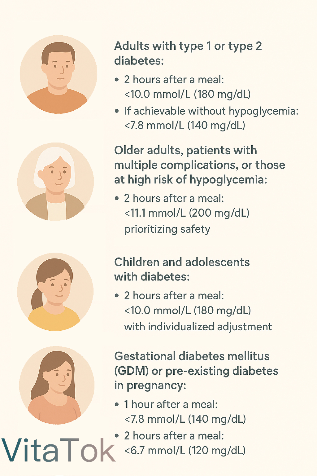 - 2 hours after a meal: <10.0 mmol/L (180 mg/dL), with individualized adjustment.